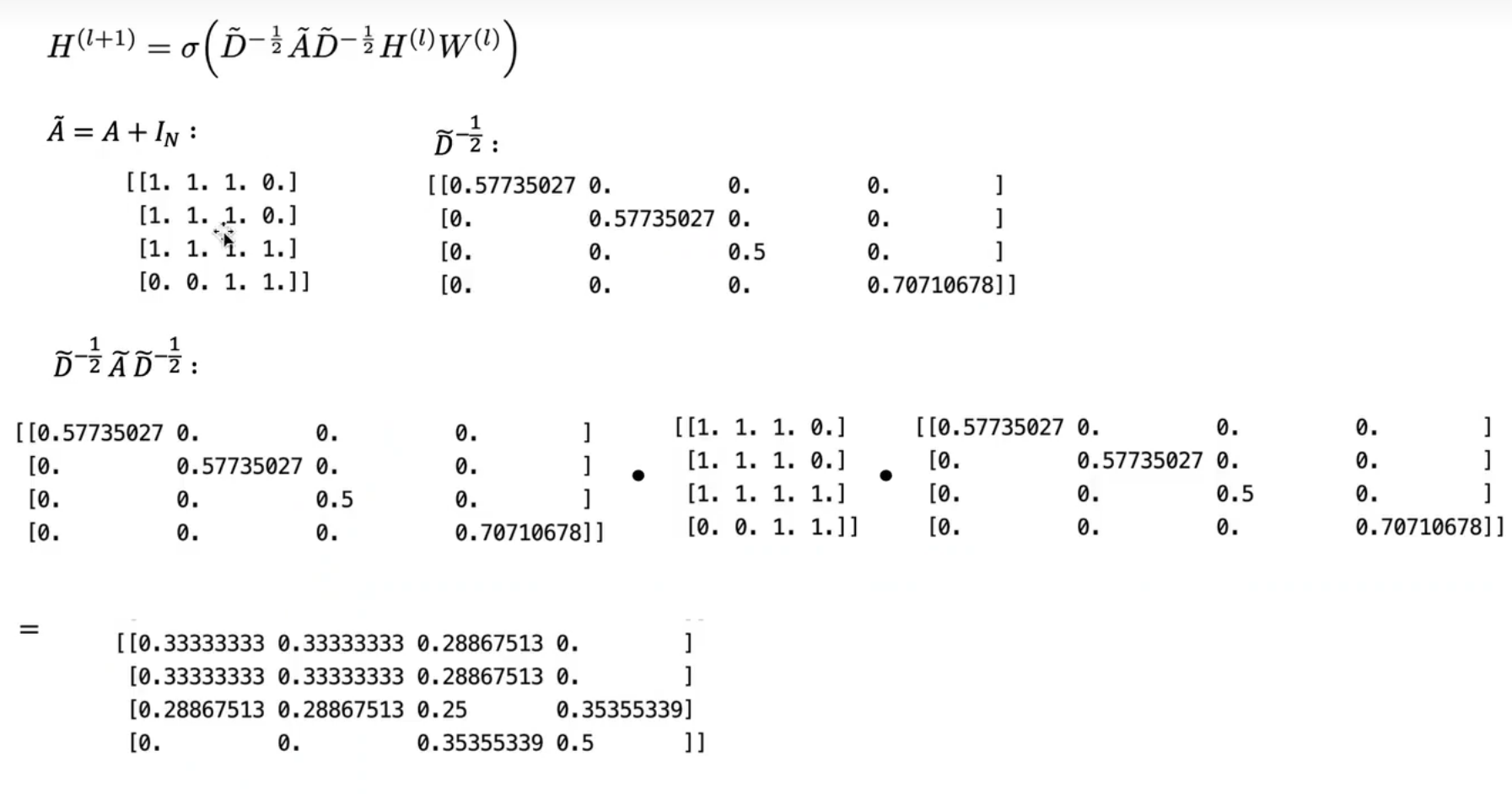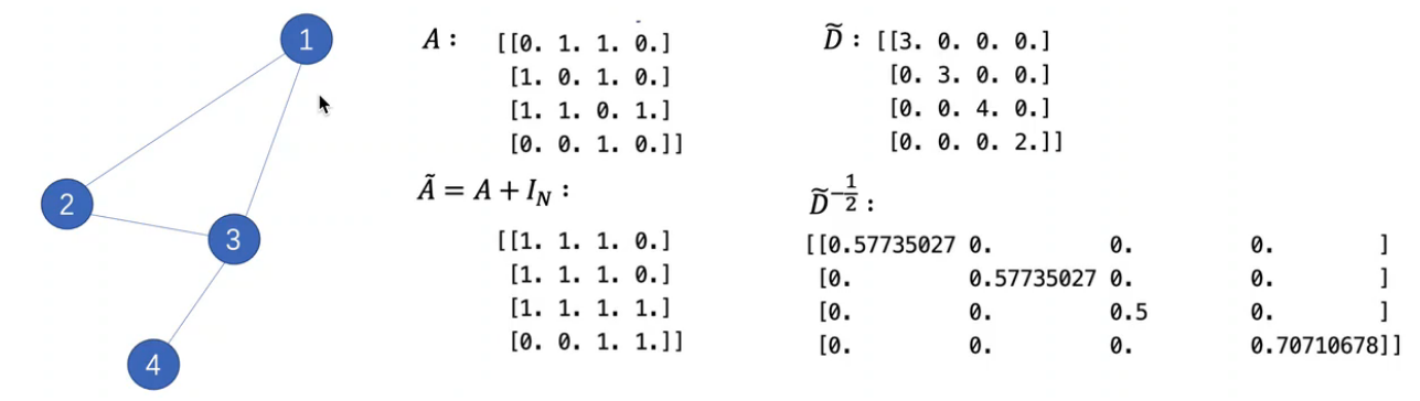 A~就是A矩阵加上一个单位阵I,A矩阵是邻接矩阵,如上,相当于是考虑这个节点周围连接的节点这个信息,如果只是A,在和特征矩阵H相乘的时候,只会计算一个node的所有邻居的特征的加权和,该node自己的特征却被忽略了。因此,可以做一个小小的改动,给A加上一个单位矩阵 I ,这样就让对角线元素变成1了。