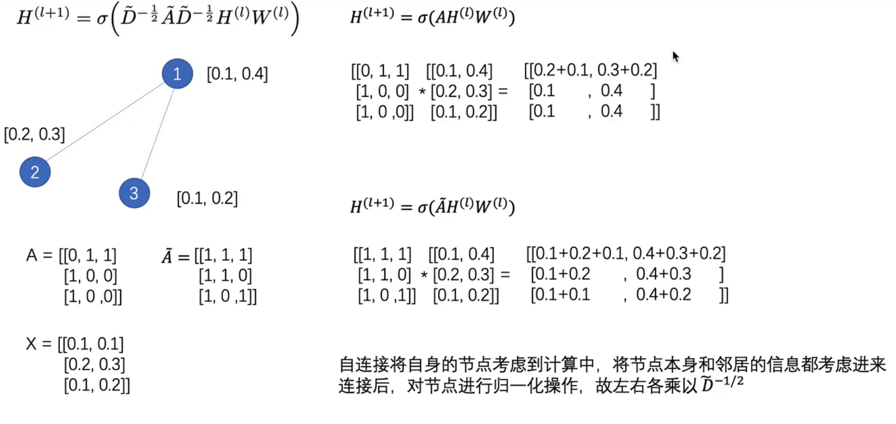 对于操作: A*H,表示对每个节点,其特征等于其链接的节点的特征之和,相当于将周围节点的特征聚合到一起,如果是A~就相当于对每个节点,加了一条指向自己的链接。